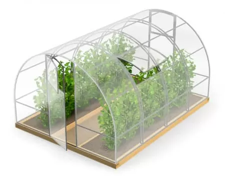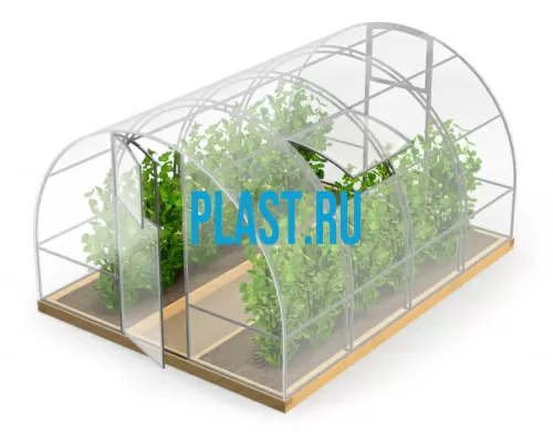 Целые дуги. Две двери, две форточки. Дуги – труба 25×25×0,8 мм; торец, двери, форточка – труба 20×20×0,8 мм. Расстояние между дугами: 1 м. Крепление поликарбоната к каркасу при помощи термошайбы(возможно комплектовать стяжной лентой). Количество поперечин: 5 шт.