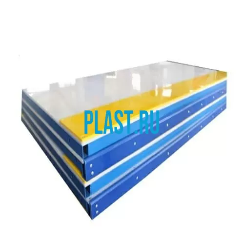 Борт хоккейный в сборе, пластик 8 мм, поручень синий 50 мм, отбойная полоса 8х200х2000 мм желтая, стальной профиль толщиной 1,5 мм, размер 40х40 и 40х25 мм порошковая покраска.
